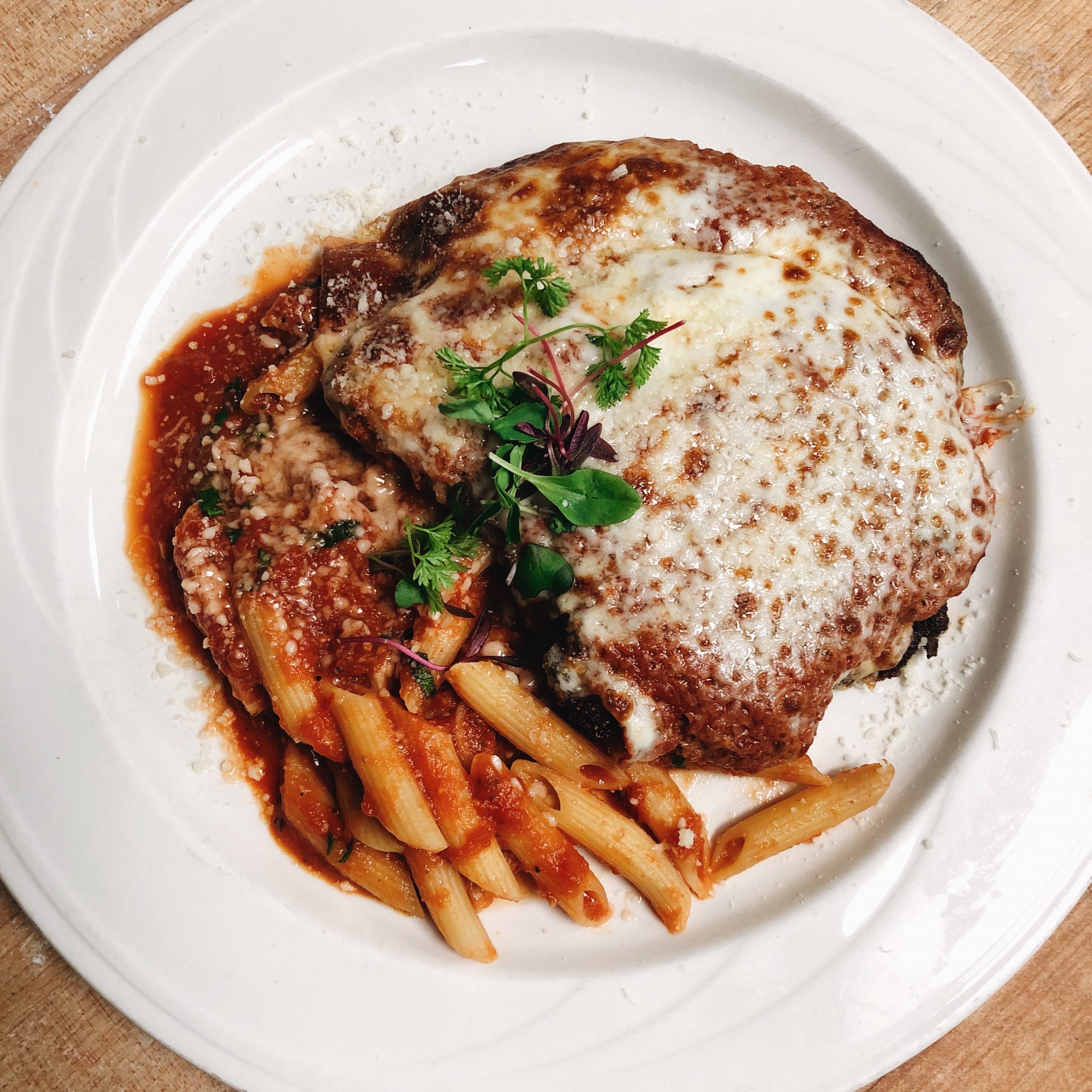 Chicken Parmesan Full size 2560 × 2560 pixels Full Menu Chicken Parmesan Breaded Chicken Breast, mozzarella cheese, penne pasta, marinara sauce. Previous image Next image